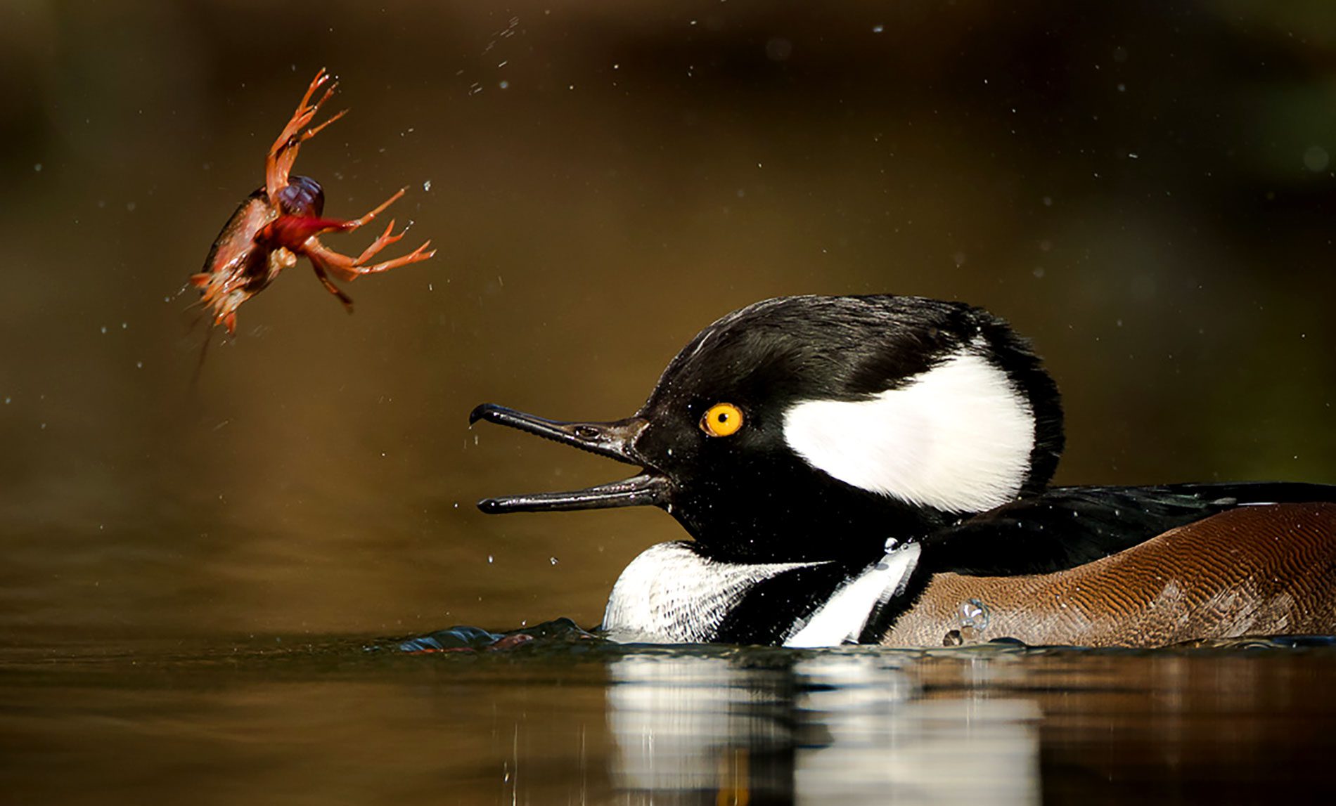 An element of water adds a little magic to any bird photo, whether the mirrored reflection of a bird’s form above the water’s surface or the moment-frozen-in-time aspect of water droplets suspended in air, dripping from a Common Nighthawk’s beak. Photographer Philip Chaon says a little luck and perfect timing coincided while birding one day at a small pond in New Mexico: “This pond is the only open water for miles around. Late in the afternoon, a dozen or so nighthawks appeared to drink. As they came down to take a sip, they would lift their wings and glide slowly, almost pausing as they took a big gulp before lifting off.”