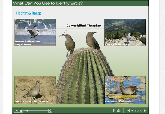 - NEW: a series of Be a Better Birder webinars. We currently are offering a four part series on waterfowl identification (May–June 2013), and are working on more topics. The live, one-hour webinars are conducted by an expert ornithologist on our staff and include instruction, polling the audience about mystery photos, and a chance to ask questions.