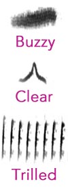We use a few simple terms to describe sound quality in a song: Buzzy, Clear, and Trilled. To help us visualize sounds, we use a very useful tool called a spectrogram. These show you time from left to right and pitch from low to high (more about how to read spectrograms).