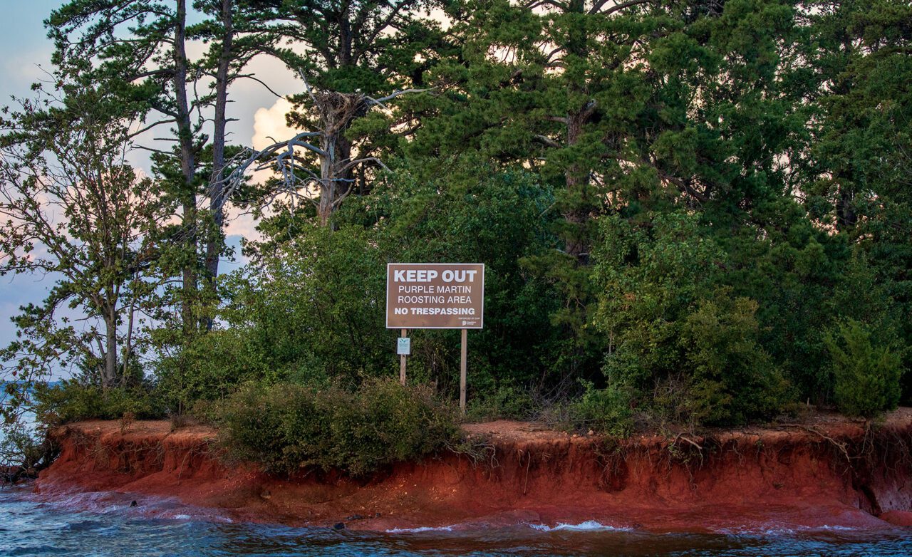 “We’re at the tail end of the season, but they’re still there,” he says as we embark on a quick ride to Bomb Island. The 12-acre island—covered in shrubs, trees, and some shortleaf pine along its western shore—was used for practice runs by B-25 bombers during World War II. Today the island is used by another acrobatic flyer that’s the reason for our early-morning sojourn: Purple Martins.