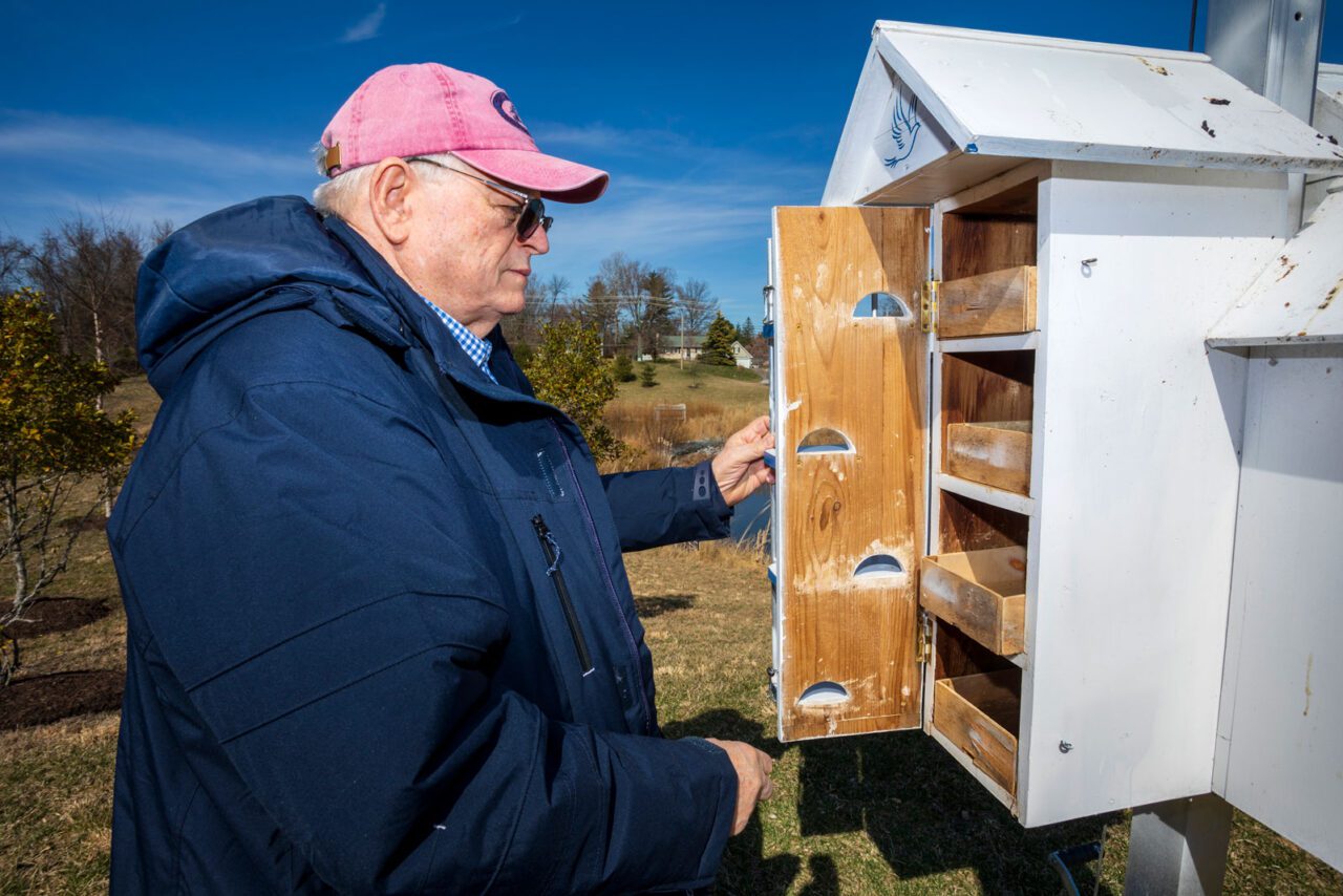 On a sunny, cold afternoon in early March, Jim Hottel walks with me to the T-14 model Purple Martin house he constructed in 2018 for the retirement community where he lives in Ellicott City, Maryland. The house is like a luxury apartment complex for 14 would-be nesting pairs of martins. Having previously built bluebird boxes, Hottel was convinced by a neighbor to build a Purple Martin house. Upon completion he was persuaded to serve as the inaugural landlord. But Hottel didn’t realize that—unlike bluebirds, in which only one nesting pair uses a box—martin landlording means serving a soon-to-be-booming colony of feathered tenants.