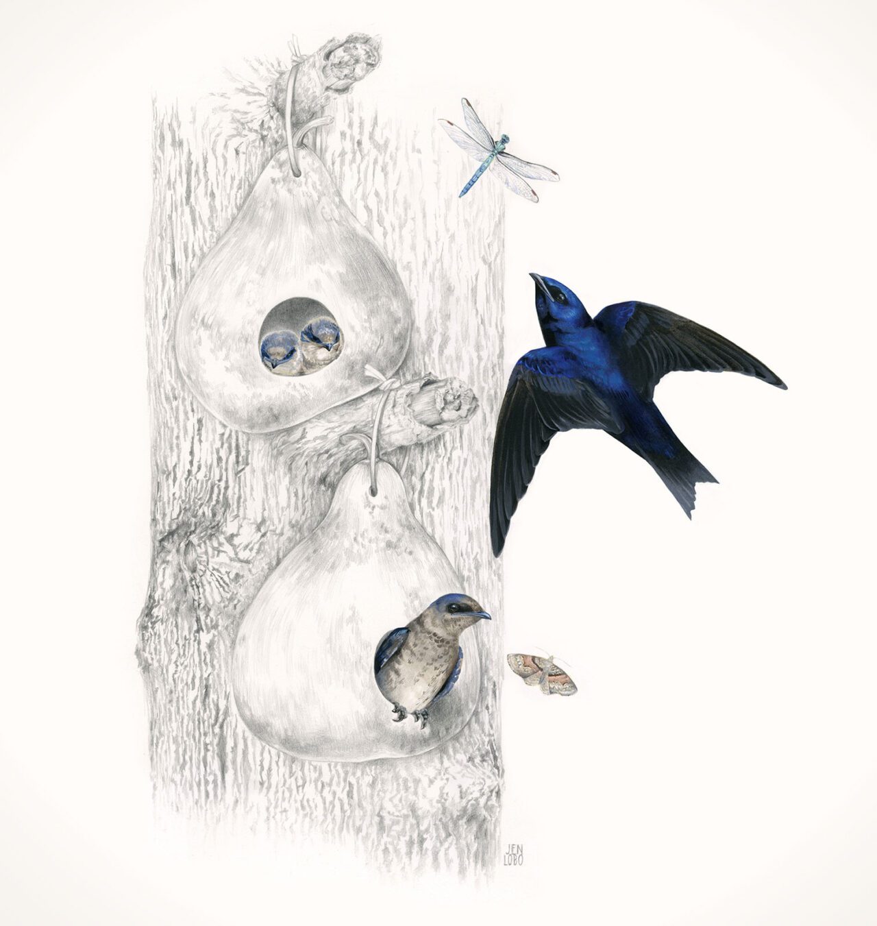 The practice of people providing housing for martins goes back centuries to the Indigenous cultures in North America, who would hang dried gourds for the birds to nest in. Kelly Applegate, a Purple Martin landlord and tribal member and commissioner of natural resources for the Mille Lacs Band of Ojibwe in Minnesota, says that having Purple Martins nest on a tribe’s territory provided security.