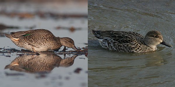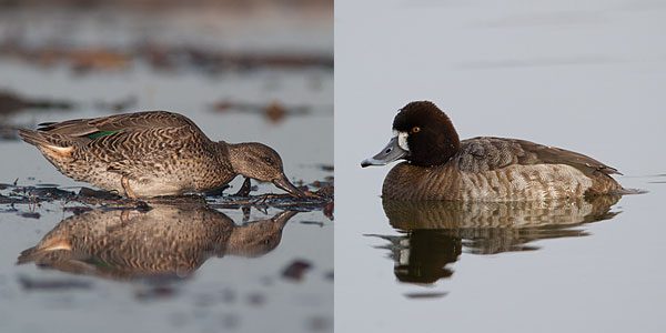 One final clue would have been size—if there had been other ducks in the photo to compare with. Green-winged Teal are astonishingly small ducks and in flocks their size difference is usually apparent.
