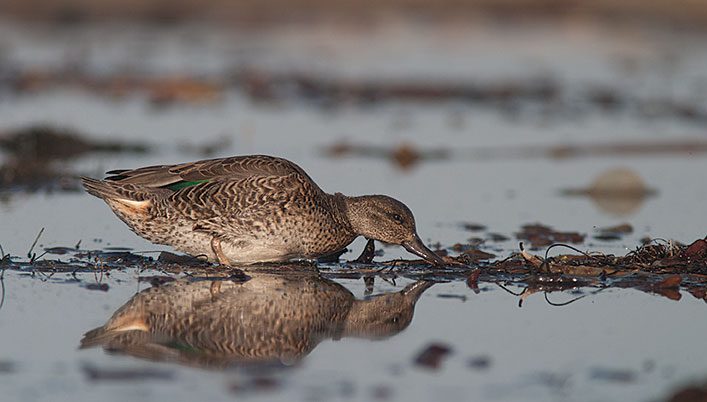 Okay, we know it’s a duck, and we know it’s snatching something from the surface. Ducks fall into two main categories—divers and dabblers. We wouldn’t see a diving duck walking to pick food off the surface, since they have legs positioned farther back on the body, making them very awkward on land. Dabbling ducks, on the other hand, are pros at searching for food in shallow water and mudflats.