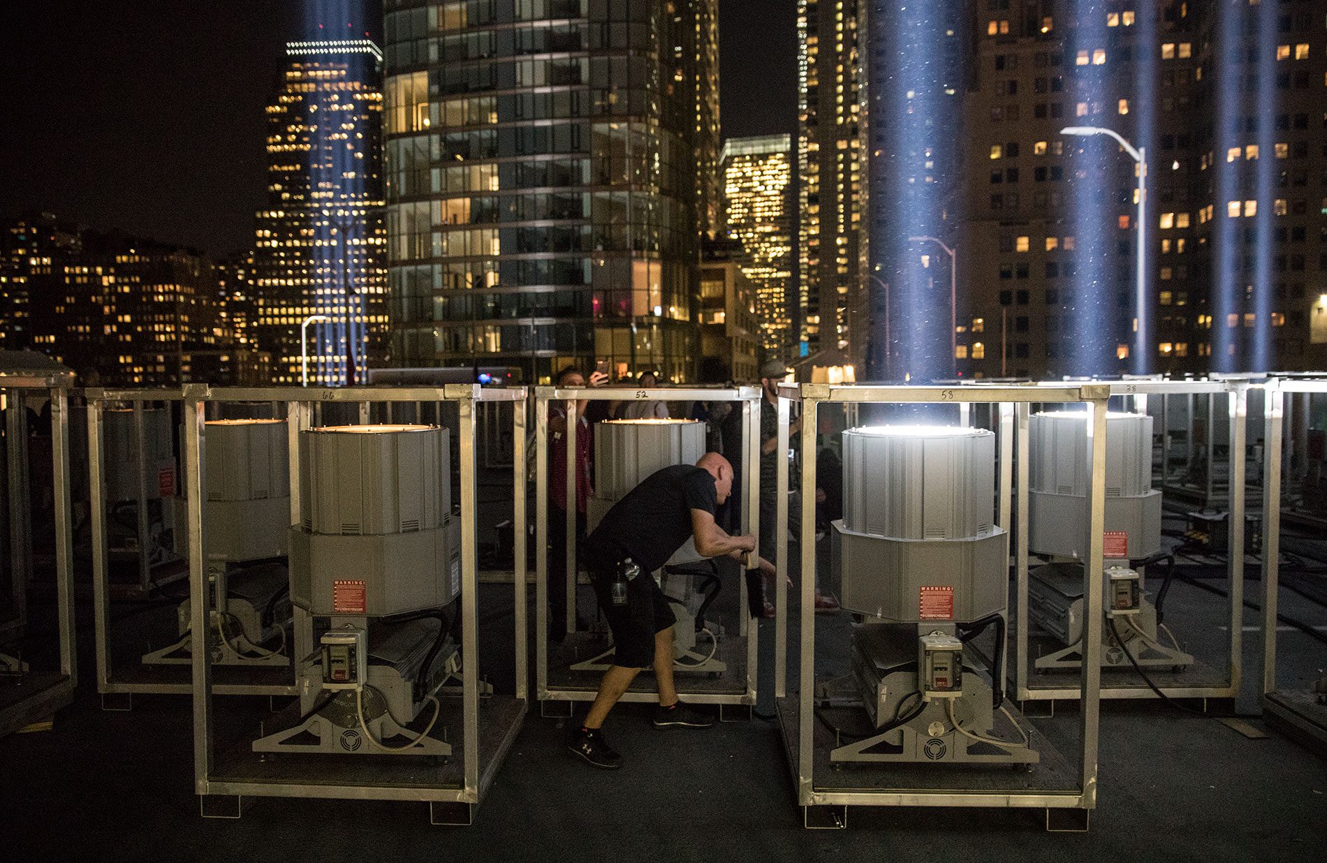 At sunset, I join a small gathering of people on top of a six-story parking garage near Wall Street. At the entrance to the upper deck, I pass the event production staff supervising the display, conferring over a bevy of laptops and switchboards. To the eastern side of the roof, rescue workers and families of the victims of 9/11 congregate near a long white tent over a dinner buffet. Opposite, to the west, New York City Audubon staff and volunteers gather. (In 2024, NYC Audubon changed its name to NYC Bird Alliance.) Dominating the roof are the spotlights: 88 in total, separated into two square arrays to the north and south, twenty parking spaces apart. As lighting technicians check their snaking cables, the beams wink with dust motes and the looping flight of insects. There are few vertical light installations in North America of the magnitude of the Tribute. Only the Luxor Sky Beam in Las Vegas, Nevada, compares. I crane my head back, looking for birds, but quickly drop my gaze, dizzy. From afar, the Tribute is a powerful spectacle. Standing below the beams, it’s staggering.