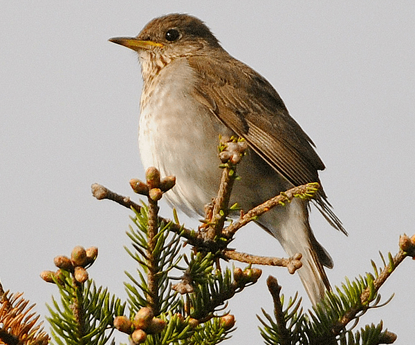 More possibilities: Gray-cheeked Thrush and Bicknell’s Thrushes The two others in our 5-species group, Gray-cheeked and Bicknell’s, aren’t as commonly seen as the previous three. They do occur widely in the East during migration, though (especially Gray-cheeked), so it’s good to be on the lookout. Gray-cheeked Thrushes are somber olive-brown across the upperparts, with a plain grayish-brown face that at best shows only a hint of an eyering. The breast has distinct spots. Their song is jumbled and burry, ending on a falling pitch.