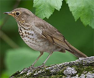 Swainson’s Thrush has the most distinctive face pattern among the Catharus thrushes: a bold, buffy eyering connecting to buffy lores to form “spectacles” against a brown face. The breast spotting is indistinct, and the upperparts are a uniform brown (usually a subdued olive-brown, or reddish-brown in the West). Their songs are flutelike and spiral higher and higher as the song goes on. They lack the Hermit Thrush’s clear introductory note.