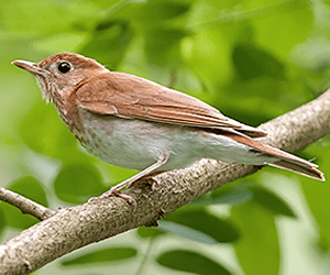 The Veery is warm rusty-red all over, and has the least distinct spotting on the underparts of any of these five thrush species. Its fluting songs tumble progressively downward; they also have a distinctive, short call note that sounds like part of its name: veer.