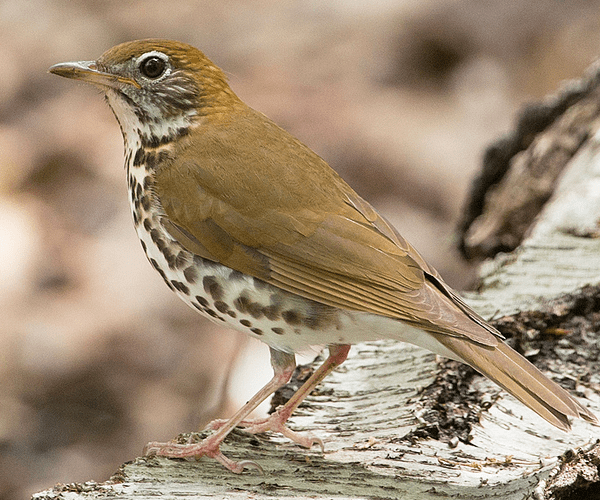 Looking closely at the photo above, we see these spots become smudgy on the sides and belly. This eliminates Wood Thrush (right) which is larger and has well-defined spots all the way down the belly. We’re left with five species in the genus Catharus: Hermit, Swainson’s, Veery, plus the less commonly seen Gray-cheeked and Bicknell’s. These thrushes can be tricky—but we can get some help from migration timing before we dive into plumage details.